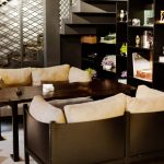 This restaurant interior features a modern and elegant design with warm lighting, a mix of plush chairs, and wooden tables.